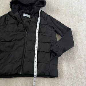 A zip up hooded puffer active vest jacket with pockets. Interior of hood has faux fur lining. Body is a puffer jacket, sleeves are like a medium weight active sweatshirt material.