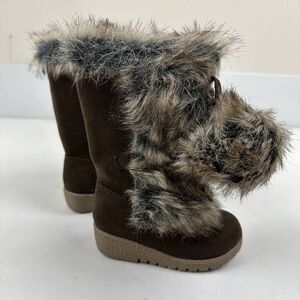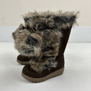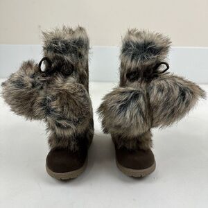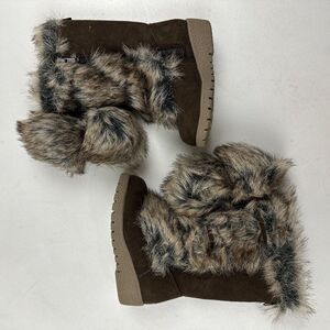 Old Navy Brown Faux Fur Lined Wedge Boots Pom Pom Side Zip Toddler Girls Sz 6 6C