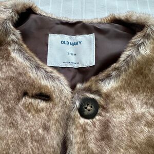 Brand new with tags (NWT) Old Navy faux fur vest in a soft brown color. Features plush faux fur texture, full lining, and easy open-front design. Perfect for layering over long sleeves or dresses for fall and winter photos or everyday wear. Size 12–18 months.