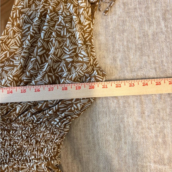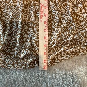 Stylish midi dress with a V-neck. Features a brown pattern. Perfect for casual outings.