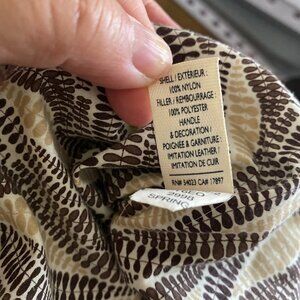 Details: Old Navy brown quilted tote bag open top nice bag in excellent condition it has an imperfection (see picture) its a discoloration near the bottom 2 front snap close pockets and one inside that zips closed