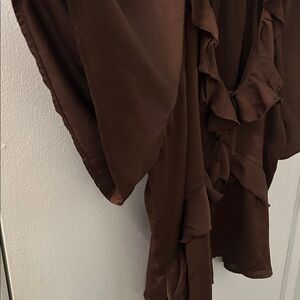 Chic brown top with ruffle details. Perfect for casual wear or to dress up.