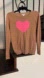 Chic tan sweater with a vibrant pink heart. Ideal for casual outings. Light weight and stretchy.