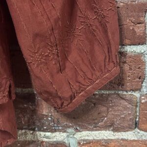 This relaxed blouse from Old Navy features a mandarin collar and 3/4 sleeves, offering a comfortable yet stylish look. The rich brown/burnt orange color and buttoned design make it perfect for both casual and business casual settings. Its lightweight fabric ensures a breezy feel, ideal for any season. Fabric is a beautiful eyelet material.