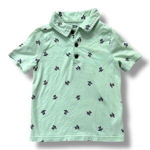 Lot of two toddler polo shirts. Gray with all over sailboat pattern is Carter’s. Light green with all over turtle pattern is Old Navy. Both 3T.