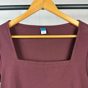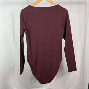 Stylish burgundy bodysuit with ribbed design and square neckline. Perfect for layering.