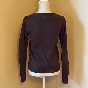 Tag reads Large, but this sweater is more like a small/medium - it hits right at the waist. Cute cabling highlights the V-neck. Sleeves are not too short.