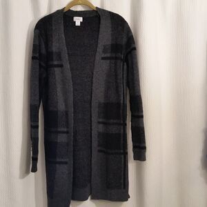 Black and grey open long sweater coat. Excellent pre-owned condition. Pit to pit approx 20 length approx 35 sleeve approx 25.