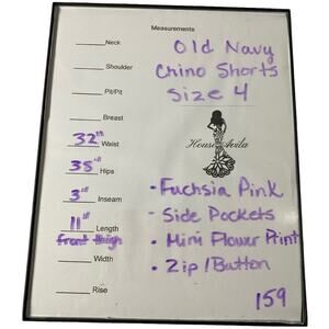 These adorable Old Navy chino shorts are perfect for a fun, casual look! The pink color is so cheerful, and the small floral pattern adds a touch of sweetness. They're a size 4 and feature a cuffed hem and convenient side pockets. These shorts are in great condition and ready for a new home. Don't miss out on adding this lovely piece to your wardrobe!