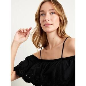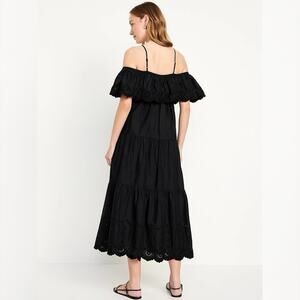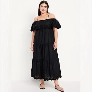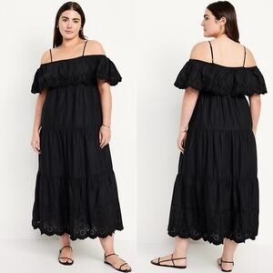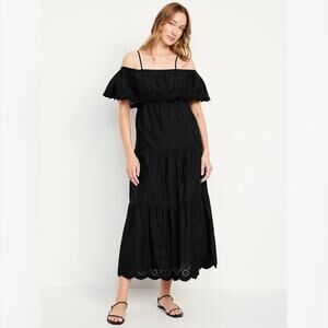 Elevate your warm-weather wardrobe with the Old Navy Cold Shoulder Maxi Swing Dress in the timeless Black Jack shade. This breezy and feminine dress features a stylish off-shoulder ruffle overlay paired with adjustable shoulder straps for a customizable fit. The elasticized back ensures comfort and ease of movement, while the tiered shirred seams add soft volume and flow to the silhouette.