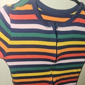 Bright and cozy footie pajamas with colorful stripes. Perfect for bedtime fun. Unisex style snug fit