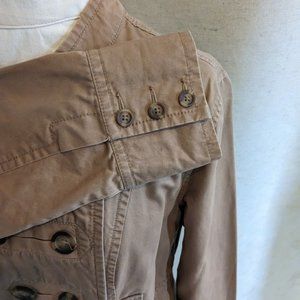 Very cute double-breasted cotton coat by Old Navy with a nod toward a military look. Dark camel brown color, in excellent condition.