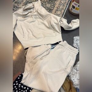 Comfortable cream hoodie and joggers set. Features zip pockets and drawstring waist. Perfect for casual wear. NEVER WORN! XS bottoms small top