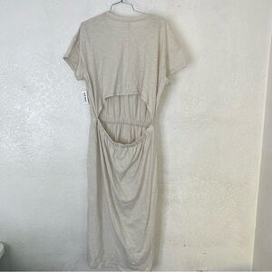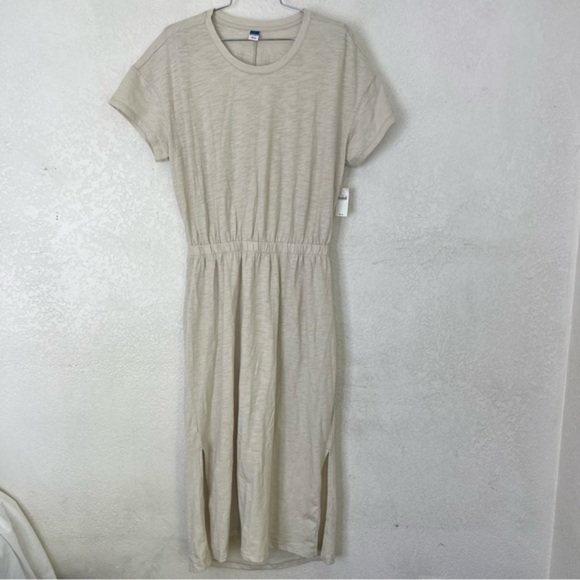Casual cream midi dress. Short sleeves. Elastic waist. Side slits.