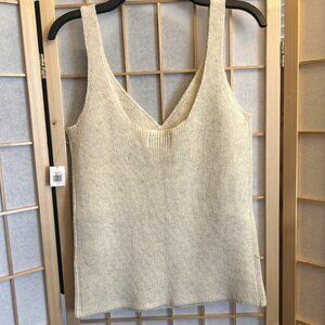 Old Navy cream / ivory heather oatmeal v-neck thick rib-knit sweater tank top, in women's size Medium. I added a photo from their site so you can see about where the v-neck will fall; the color listed on their site is 'cream,' but it is heathered with a little gray so it's more of an oatmeal (see pictures for reference). This is a thick, rib-knit cotton-blend yarn with 5% wool for added warmth. Tank is a very stretchy knit; easy pullover style. Fabric: is 55% cotton 40% recycled polyester, and 5% wool. Care: machine wash cold, dry flat, cool iron. Excellent like new condition; never worn - tag still attached.