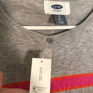 Great condition, new with tags. Old Navy. Crewneck Button Down Cardigan. Gray color with orange and pink stripes, color name is coral tropics. Size small petite. 55% cotton, 30% polyester, 15% acrylic. Pit to pit laying flat 17.5” Shoulder to hem 21.5” Sleeve (pit to hem) 19”. All measurements are approximate and taken lying flat. Smoke free home. No trades, offers welcome.