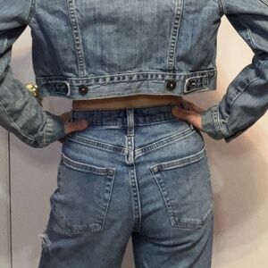 Spread collar. 5 button fastening. Buttoned cuffs. Light wash. GREAT condition!