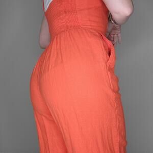 Old Navy Cropped Orange Jumpsuit - Size Small - Linen Rayon Blend - Spaghetti strap - square neck - has pockets - elastic in back - adjustable straps - Great pre-owned condition!