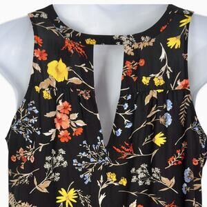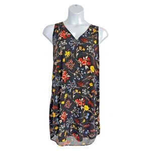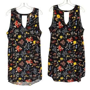Women's sleeveless, v-neck, shift dress with asemmetric high=low hemline and cutout back neckline. All-over floral print. Black rayon fabric with vivid flowers. Relaxed flowy fit.