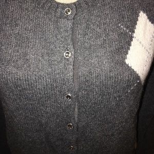 New with tag, cute preppy look, jeweled buttons, silver tinsel thread over Argyle design on left chest, Ribbed wrist and hip openings. 55% Cotton, 20% viscose, 15% acrylic, 10% rabbit hair.