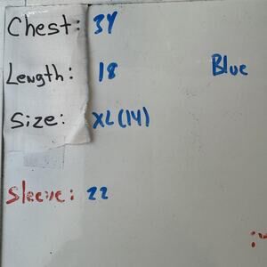 Actual Measurements (as noted on markerboard): Chest 17 in, Length 18 in, Sleeve 22 in