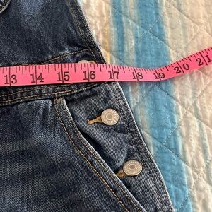 Classic dark blue denim overalls from Old Navy. Petite length. Measurements in photos.