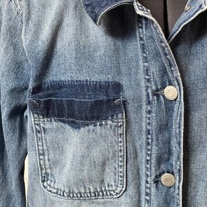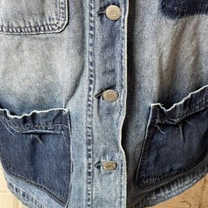 Distressed. Note one breast pocket only - not two. Two bottom pockets. Button front. Two patches. No holes, rips, or stains.