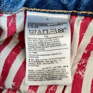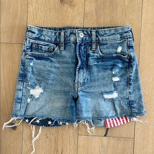 Trendy distressed denim shorts. Features frayed hem and ripped details. Pockets are stars and stripes.
