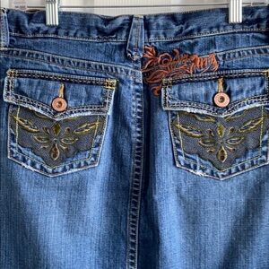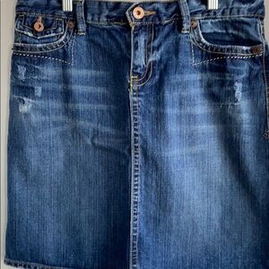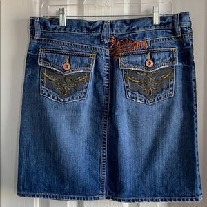 Old Navy distressed mini skirt with embroidery detail on and above back pockets. From 2006. Size 8. Button pockets in back. Front pockets. Stitching detail around pockets. 100% cotton. The length is 19". Excellent pre owned condition.