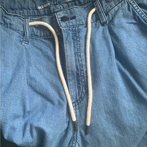 Comfortable blue denim wide leg jeans with drawstring waist. Ideal for relaxed style or dress.