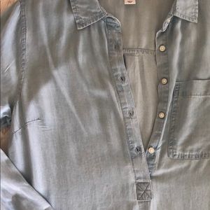 Light wash denim • White button down detailing • Lightweight material (100% lyocell) • Curved shorter sides • Cuff buttons that can be rolled up • Only worn twice