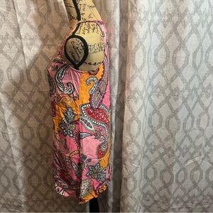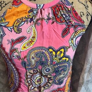Color pink with purple, red, orange, white, and yellow paisley print