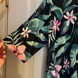 This dress is above the knee with short sleeves. Nice material that doesn't cling. Very pretty pattern. Great dress for the Spring/Summer or if you're lucky enough to get away in the winter to somewhere sunny.