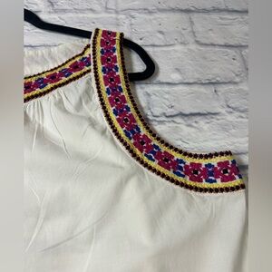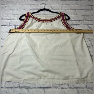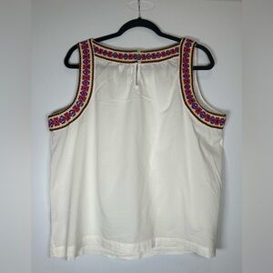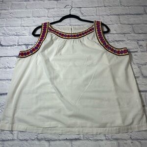 White sleeveless top with vibrant embroidered details. Perfect for adding a touch of color to your wardrobe.