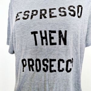 Old Navy heather gray graphic tee with text that reads "Espresso Then Prosecco" across the front in black capital letters.