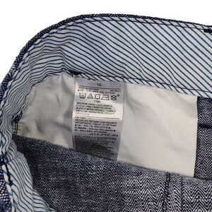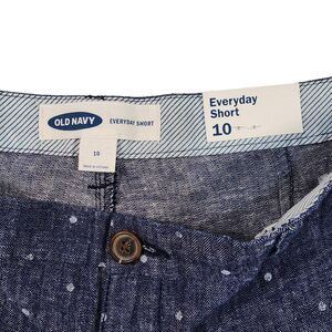 The chambray blue color and polka dot pattern give a classic and fun look. The zip closure and flat front provide a comfortable fit while the lightweight linen blend material makes them perfect for walking, school, or the beach. These shorts are a size 10 with a mid-rise waist size and feature pockets for added convenience.