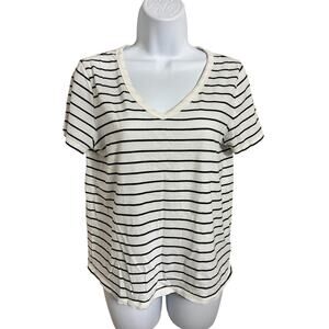 Comfortable v-neck tee in a black and white striped design. It is a v-neck tee with short sleeves. It is in good pre owned condition.