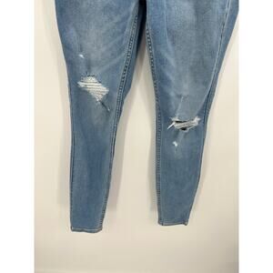 Extra high rise Rockstar super skinny blue jeans. Light wash blue denim, factory distressing, high rise. Cotton blend denim.