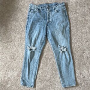 The most versatile jeans from Old Navy. These are the High-Rise OG Straight with extra stretch and secret-smooth pockets. They are a lighter blue wash with distressed details at the knees. Perfect for casual wear or can be dressed up! Inseam is 26”.