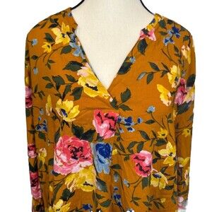 Old Navy FLORAL Print Long Sleeve Popover Rayon Blouse Gold Blue Sz XXL NEW