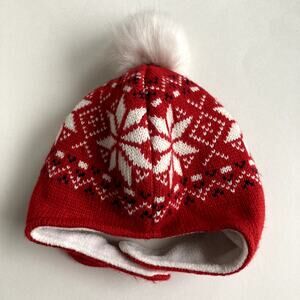 Fleece lined trapper hat in red and white fair isle knit with faux fur pom. Hook and loop closure under chin.