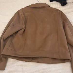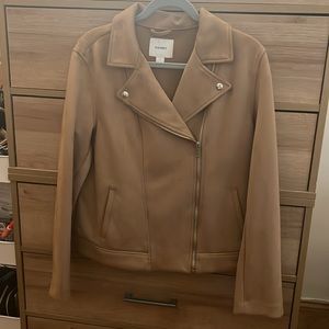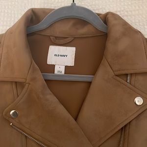 Camel colored faux suede moto jacket from Old Navy. 90% polyester, 10% spandex/elastane. Only worn a few times, some discoloration on the inside tag but otherwise in excellent condition. Size L.