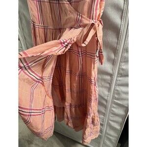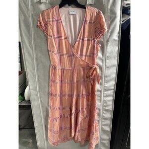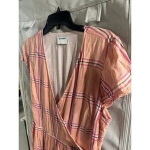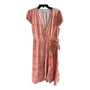 Old Navy Faux Wrap Dress Orange Pink Plaid Short Sleeve V-Neck Ruffle Womens M