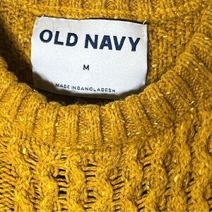 Elevate your wardrobe with this classic and timeless Old Navy sweater. The mustard yellow color adds a pop of color to any outfit, while the cable-knit and textured design gives it a unique and stylish look. The crew neck and long sleeves make it perfect for cooler weather, and it comes in a size M with a straight sleeve type.