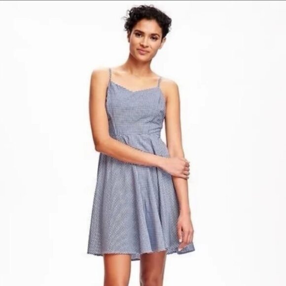Old Navy Fit Flare Cami Blue White Gingham Smocked Summer Swing Mini Dress