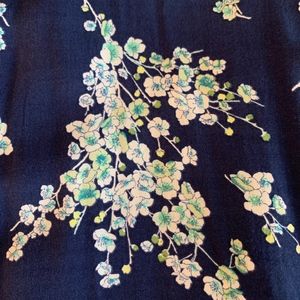 Lightweight material, stretchy patch on back with zipper on side. V-neck with adjustable spaghetti straps. White and turquoise flowery pattern on navy.