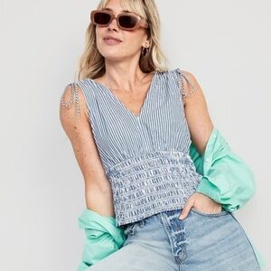 This sleeveless blouse from Old Navy features a charming smocked waist and tue shoulders offering a flattering fit. The light blue and white stripes add a fresh, summery vibe, perfect for warm weather. Crafted from breathable fabric, it's an ideal choice for casual outings.
