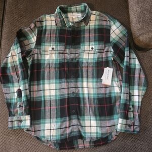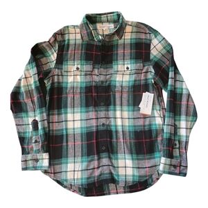 This Old Navy Flannel Flex Shirt is designed for women in size M, featuring a mixed print of red, green, and white plaid. The shirt has a collared neckline, long sleeves with a casual sleeve type, and a relaxed fit. Made of 100% cotton with a rayon fabric type, it has a button-up closure and comes with accents of buttons. Suitable for various occasions such as travel, casual outings, work, or business settings, the shirt is lightweight, breathable, and easy to care for, making it a versatile and comfortable addition to your wardrobe.