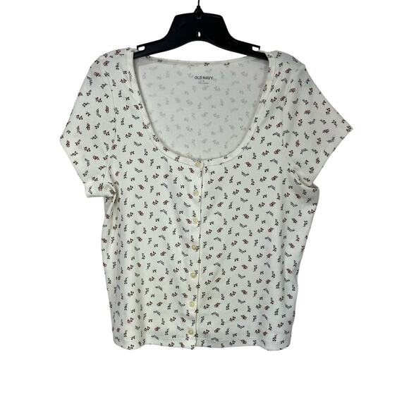 Cute and casual Old Navy ribbed short-sleeve button-front tee with a white base and mini floral print. Soft and stretchy — perfect for layering or everyday wear.