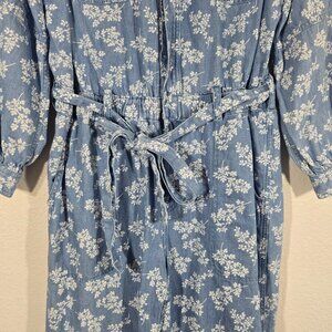 Old Navy Floral Chambray Jumpsuit Women Large Blue Tie Belt Long Sleeve Boho Hip. Pre-owned